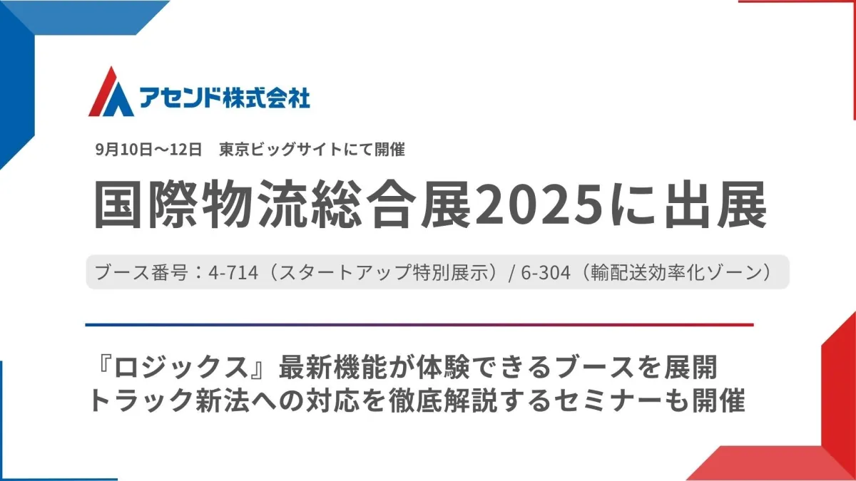 アセンド株式会社は、国際物流総合展2025(INNOVATION EXPO)に出展し、同社の運送管理システム「ロジックス」を体験できるブースを設置します。この展示会は、2025年9月10日(水)から12日(金)まで、東京ビッグサイトで開催される予定です。アセンドのブースでは、最新の機能を実際に触れて体験できる機会が提供され、来場者にとっては貴重な情報を得る場ともなります。
