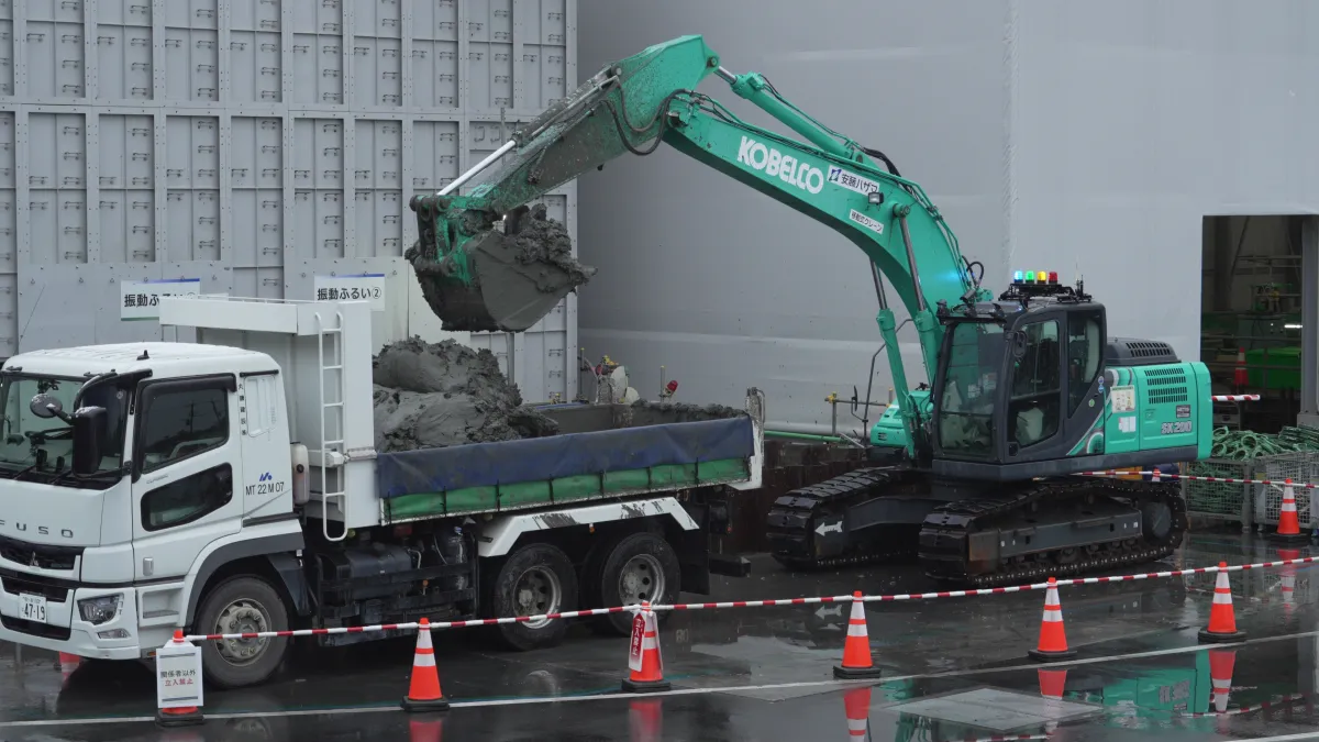 自動運転ショベルの稼働: シールド掘削による土砂排出量や土質に関して、現場スタッフがタブレットを使って柔軟に調整しながら作業を実施。