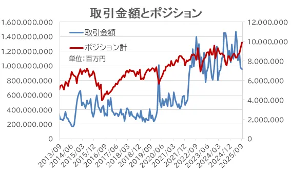 一般社団法人金融先物取引業協会が発表した情報によると、2025年9月のFXにおける取引金額は953兆円となり、前月の980兆円から約2.76%減少しました。これには主にUSD/JPYの取引額の減少が寄与していますが、未決済ポジションが9兆9,206億円と増加し、特に米ドル/円のロングポジションが8.58%増加したことが円安期待の高まりを示しています。