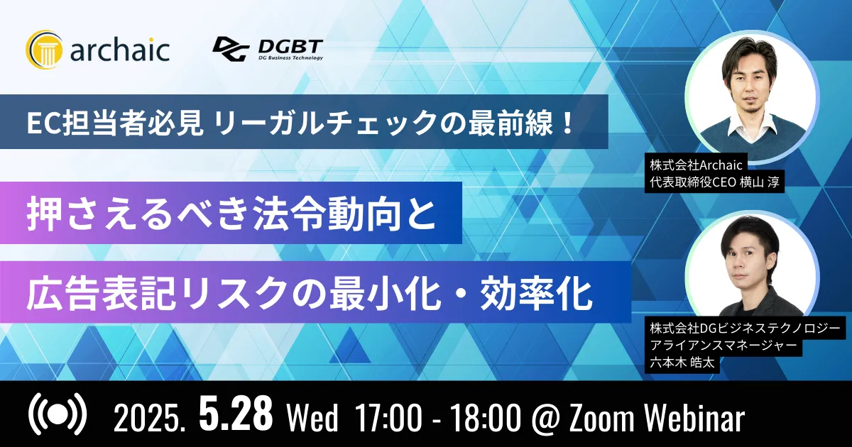 デジタルビジネスの支援を専門とする株式会社DGビジネステクノロジーが、同グループの株式会社Archaicと共に、2025年5月28日(水)にオンラインセミナー「EC担当者必見!リーガルチェックの最前線」を開催します。このウェビナーは、EC業界に関連する法令の最新動向や、広告表記リスクを最小限に抑えるための実践的なノウハウを提供するものです。