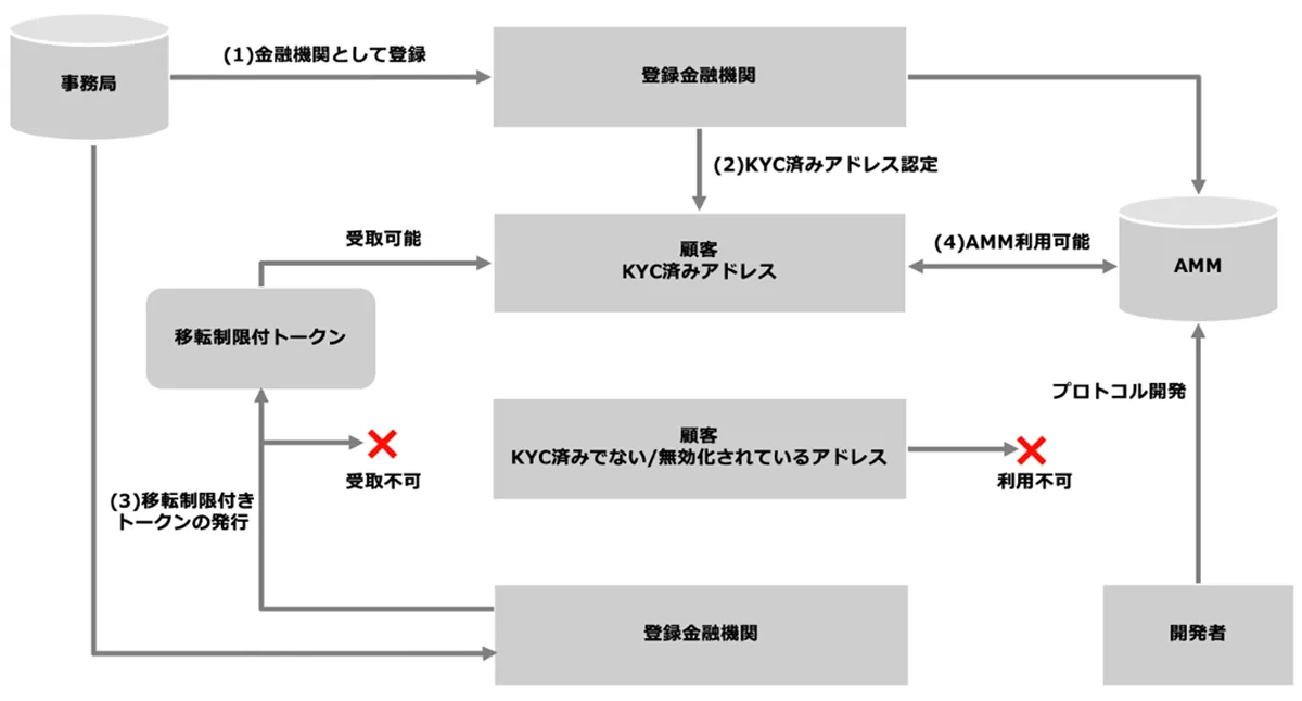この実証実験では、特定の金融機関が提供するKYC済みアドレスのみがDeFiサービスを利用できる環境を整備することを目指しました。これにより、利用者は規制対象のトークンでも安心して取引が行えるようになり、トークンを利用した新たなビジネスの創出へとつなげる狙いがあります。
