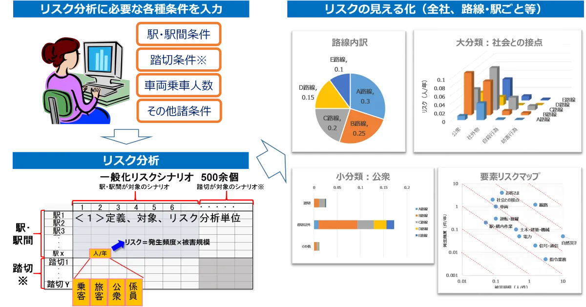 - - 安全上のリスクの対象: 運行中の列車に関わる対人リスクを対象とし、定量的に評価します。