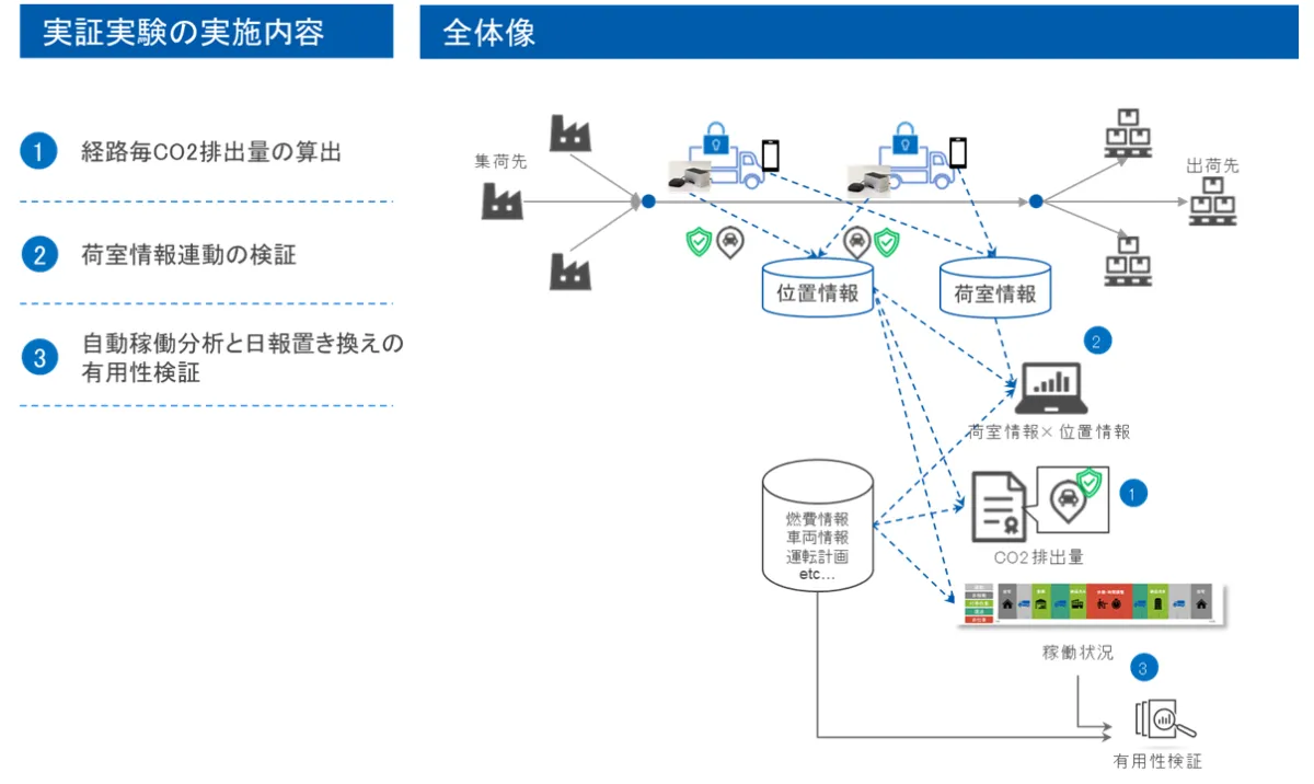 特に注目すべきは、物流業界が環境への影響をどう軽減していくかという点です。この位置認証プラットフォームでは、トラックの走行ログや荷室情報をもとに、配送単位や荷主単位でのCO2排出量を自動的に算出する仕組みを構築し、持続可能な物流ソリューションを提案します。これにより、環境保護に貢献すると同時に、運送事業者の業務効率も向上することが期待されています。