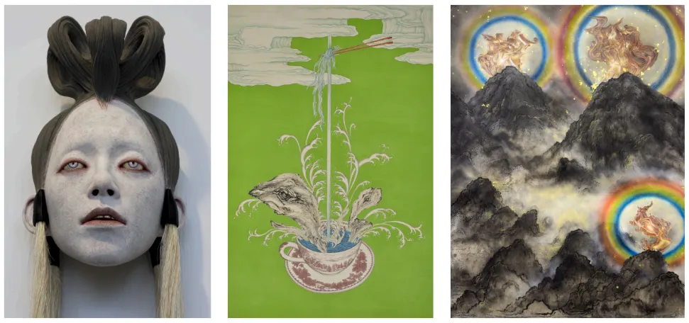 アン・ソンミンは、韓国の伝統絵画を現代の視点から再解釈し、文化と時間の交流を描き出します。彼女の作品は、複数の視点を持つ東洋的な逆遠近法を取り入れ、異なる文化の共存を表現しています。《Peonyhat Vanilla 4》などの作品は、その多層的でハイブリッドな空間によって、アートの可能性を広げるものとなっています。