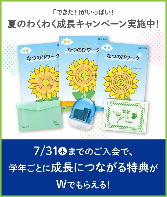 この「夏のわくわく成長キャンペーン」を通じて、Z会は楽しく学ぶ姿勢を育むだけでなく、夏の間にも「できた!」の実感が得られるプログラムを保証しています。お子様の成長を促進する絶好の機会ですので、是非この期間に入会をご検討ください。参加することで得られる特典と学びの機会が、未来への第一歩を支えます。