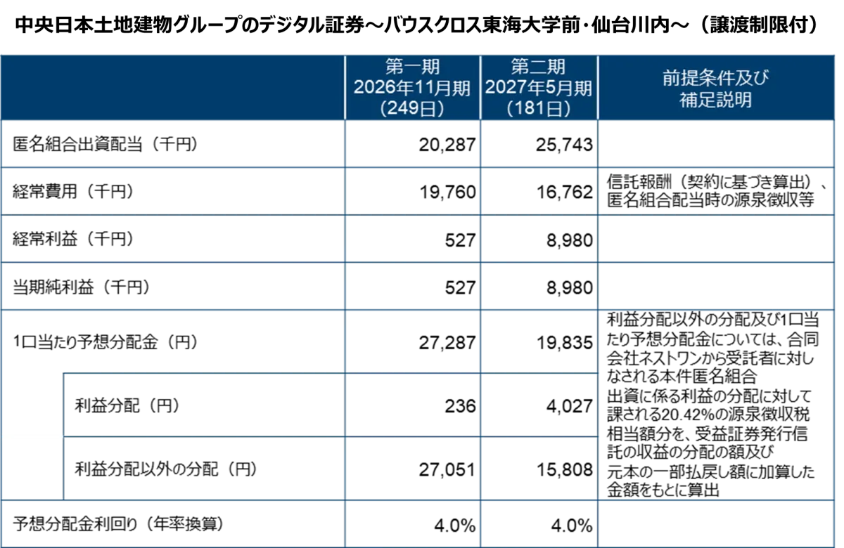 本ファンドの運用は、二つの計算期間に分かれています。第一期は、2026年2月26日から2026年11月1日までの約8か月、第二期は2026年11月2日から2027年5月1日までの6か月間です。ファンドは、年間2回の分配金を見込んでおり、この分配金は投資対象不動産から生み出されるキャッシュフローに基づいて支払われます。