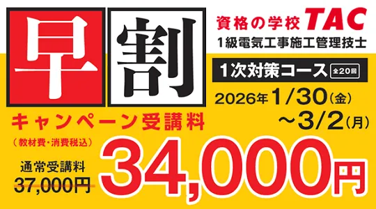 2026年度に向けた1級電気工事施工管理技士試験の第一次対策講座が、TAC株式会社によって販売が開始されました。特に注目すべきは、早割キャンペーンが実施されており、受講料が通常よりも安くなっています。この機会を逃す手はありません!