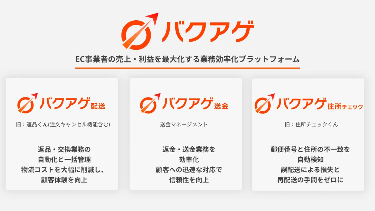 「バクアゲ」は、EC事業者の成長を支えるための基盤として進化を続け、顧客対応や配送情報の最適化、送金・返金フローの自動化など、サービスを段階的に拡充していきます。