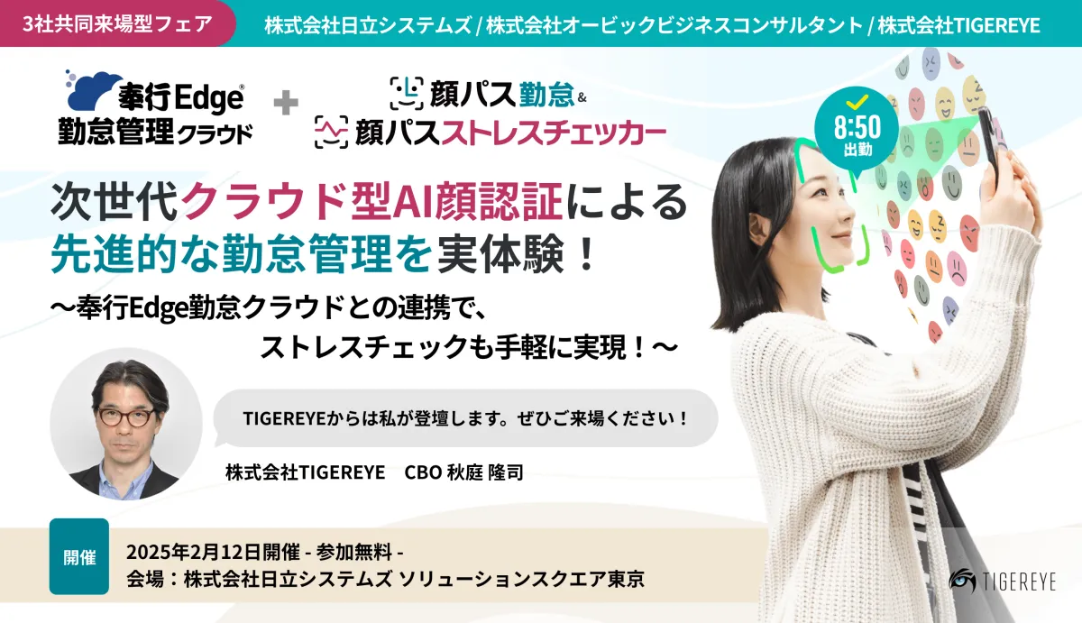 2025年2月12日(水)、東京大崎で行われる来場型のフェアにて、株式会社TIGEREYEが開発した次世代の顔認証システム「顔パス勤怠」を体験できます。このイベントは、株式会社日立システムズおよび株式会社オービックビジネスコンサルタントとの共同開催で、最新の勤怠管理技術に足を運ぶ絶好の機会となります。