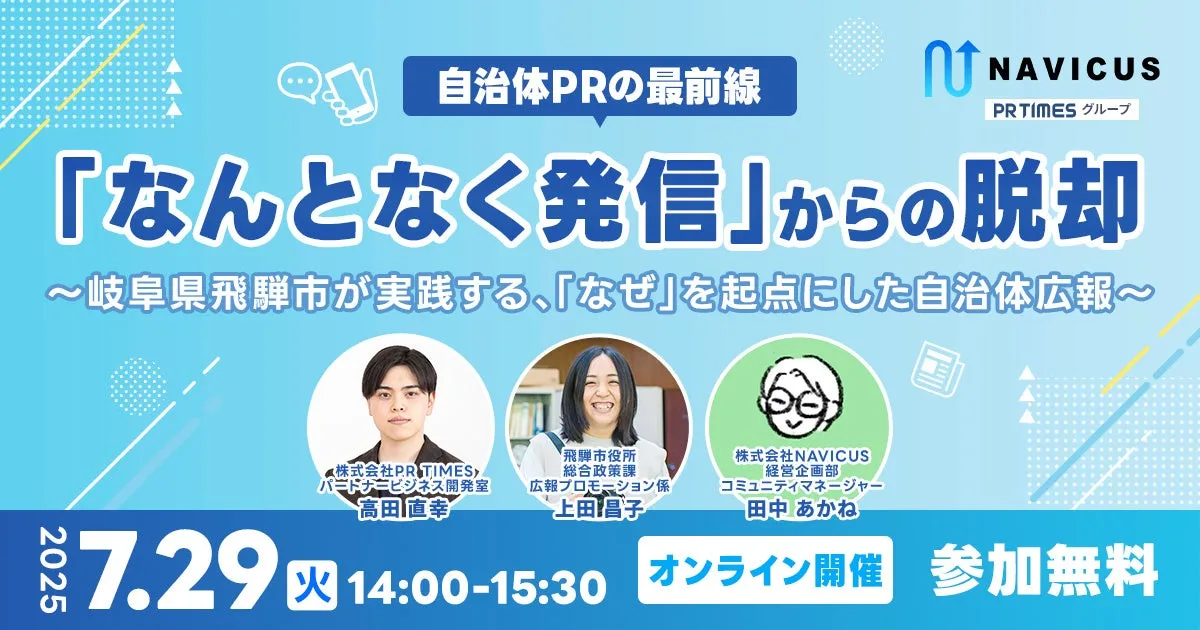 2025年7月29日、岐阜県飛騨市で開催されたウェビナー『自治体PRの最前線 『なんとなく発信』からの脱却』は、SNSやプレスリリースを通じた新しい広報戦略について、自治体職員へ向けて実施されました。主催は株式会社NAVICUS、株式会社PR TIMES、そして飛騨市の三者です。