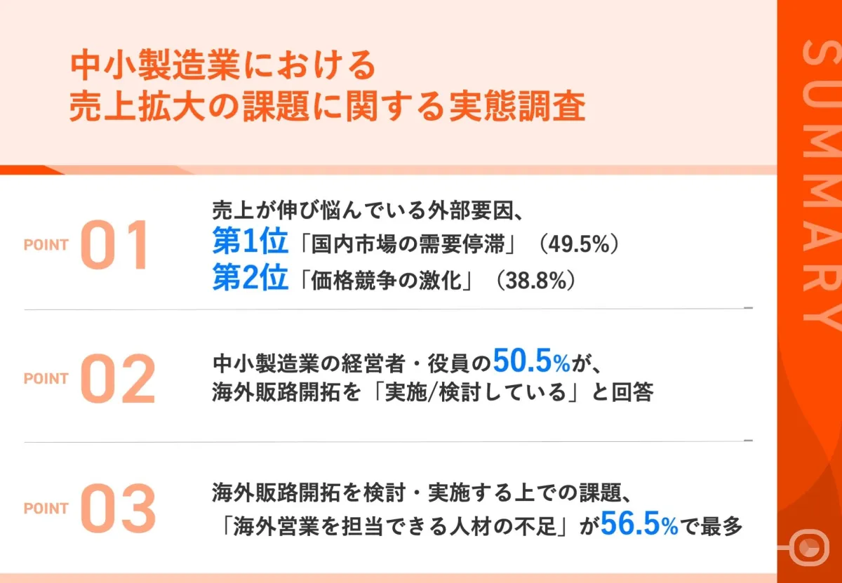 国内の経済状況や市場需要の変化により、中小企業は単一の市場に依存した成長戦略が難しい時代に突入しています。「価格競争の激化」(38.8%)や「原材料・部品等の調達コスト上昇」(37.9%)といった課題も多く見受けられ、これまでの改善策では限界があることが示されています。また、自由回答の中には「製品ライフサイクルが早い」「ブランド知名度の低さ」といった意見もありました。
