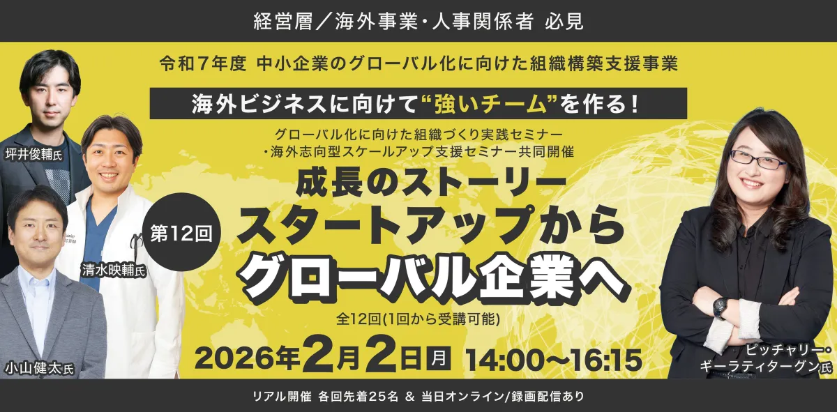 このセミナーは、2026年2月2日に開催される第12回の開催であり、今年度最後のチャンスとなります。スタートアップ企業が国際的な舞台で活躍するための人材マネジメントの秘訣を学ぶパネルディスカッションが行われ、さらに特別企画としてタイ国家イノベーション庁による貴重な講演が予定されています。このような内容は、国際競争が激化する中での企業の成長に非常に役立つ情報です。