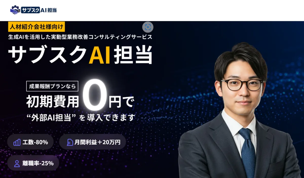 『サブスクAI担当』は、人材紹介業に特化したAI導入支援サービスです。企業がAIを内製することなく、月額0円から使える手軽さが魅力です。これにより、企業はAI実働チームの成果を享受しつつ、本業に専念できる環境を整えることが可能になります。