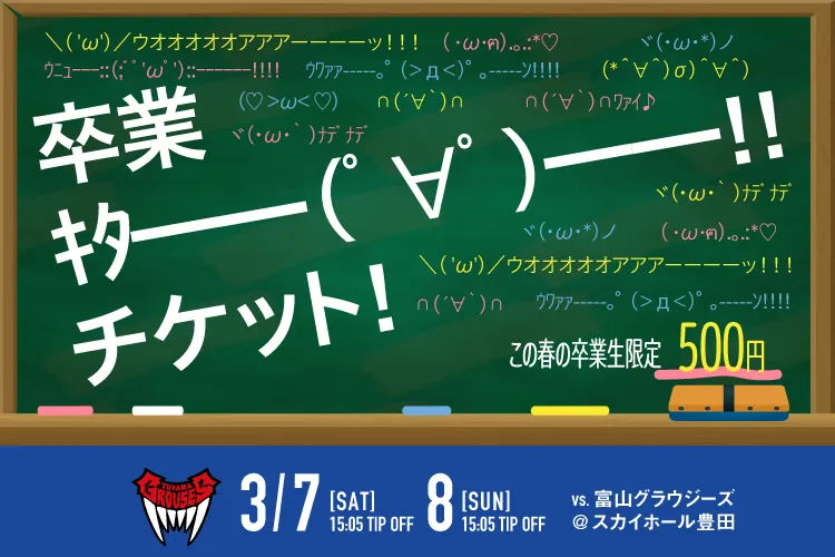 この春、卒業を迎える皆さんに朗報です!シーホース三河が、卒業生を対象にした特別チケットの販売を開始します。「卒業キタ━━(゚∀゚)━━!!チケット!」は、卒業生の皆さんが、500円という特別価格で試合観戦を楽しめる嬉しい企画です。