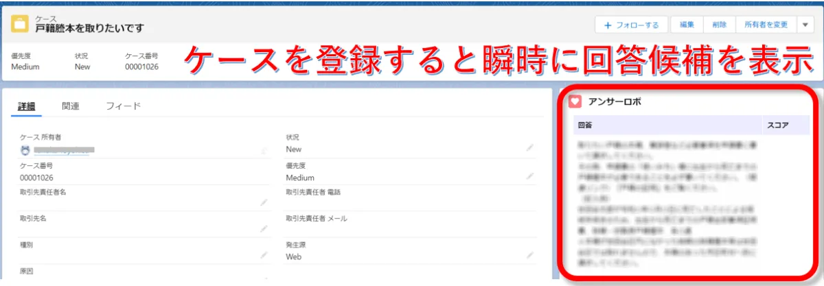 アンサーロボの特徴として、キーワードが不一致でも情報を検索できる点が挙げられます。これにより、同じ単語が含まれている文書の中から、関連性の高い情報を優先的に抽出することができます。この高精度な検索は、特別な辞書登録や学習データがなくても実現されており、生産性の向上を期待できるでしょう。Salesforceに蓄積された過去のデータを参照しやすくなることで、企業の業務効率も大幅に改善される予感がします。