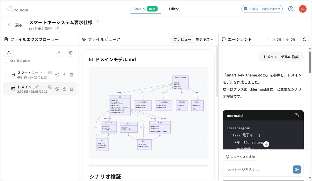 CoBrainにおいては、生成された要求分析結果が自動的に保存され、後から簡単に確認や編集ができる点も大きな利点です。また、Markdown形式の要件書やUML図など、視覚的な成果物がリアルタイムでプレビューできるため、開発者にとって極めて使いやすい環境が整っています。