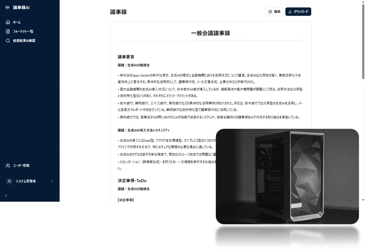 高性能PCによる高速処理:専用の高性能GPUを搭載したPCを使用することで、処理速度と精度が大幅に向上し、実務に即した議事録を迅速に提供します。