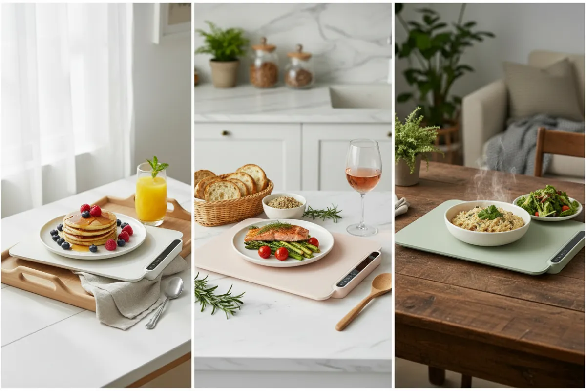 フードウォーマーは、60℃、80℃、100℃の3段階の温度調節が可能です。それぞれの料理や食事シーンに応じて、最適な温度で料理を保持することができます。例えば、朝食のトーストやティータイムのスイーツを温かい状態で楽しむための温度調整が可能です。