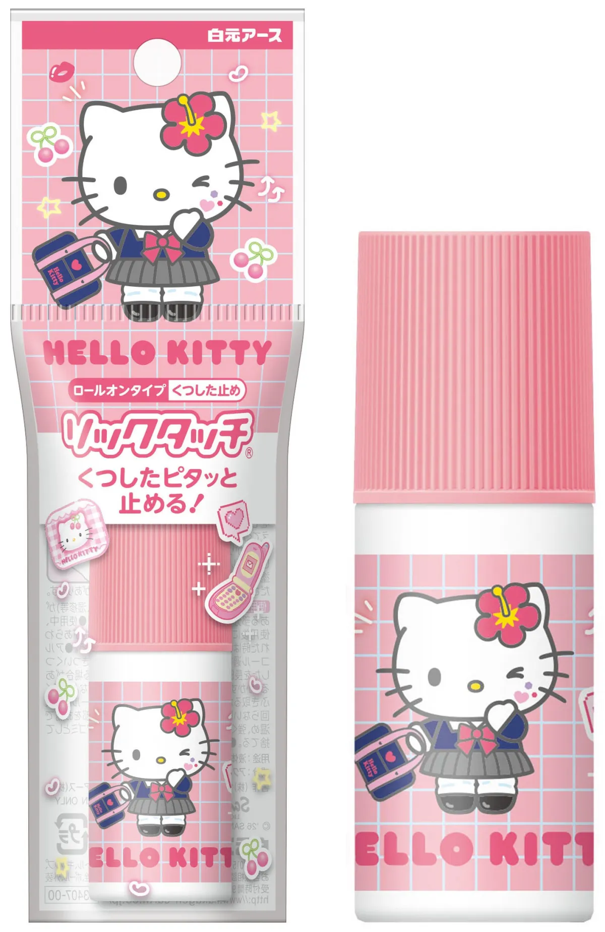新商品の「ソックタッチハローキティ」は、株式会社サンリオの人気キャラクター、ハローキティを起用した特別なロールオンタイプのくつした止めです。バッグに入れておきやすいサイズ感も魅力の一つで、外出先でもサッと使用することが可能です。30代から40代の女性を中心に、当時のルーズソックスブームを経験したユーザーを意識したデザインに仕上げられています。