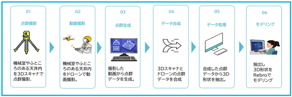 この新たな手法を実現するために、必要な手続きを進め、実運用に向けたトレーニングを行っています。また、精度の高い3Dモデルを生成するための飛行方法とデータ処理のフローを確立しました。具体的には、撮影した動画から点群データを作成し、BIMソフト(Rebro)への変換も行っています。