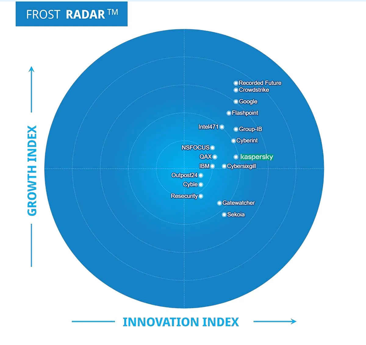 Frost & SullivanのFrost Radarレポートは、企業を「成長」と「イノベーション」という二つの指標を基に評価します。成長指数では、企業のビジョンや実行能力、強力なイノベーションパイプラインが評価され、イノベーション指数では将来のメガトレンドに対する企業の適応力が判断されます。Kasperskyは、これら両方の指標で高得点を獲得しました。