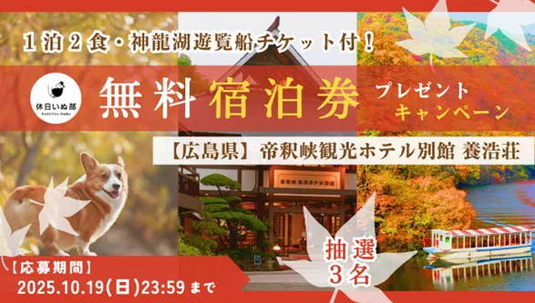 ペットとともに楽しむ旅行をサポートする「休日いぬ部」が、新たに帝釈峡観光ホテル別館・養浩荘とともに、愛犬との宿泊体験をさらに充実させる特別企画を発表しました。このキャンペーンでは、紅葉が美しい季節に行える特別宿泊プランをご用意しています。