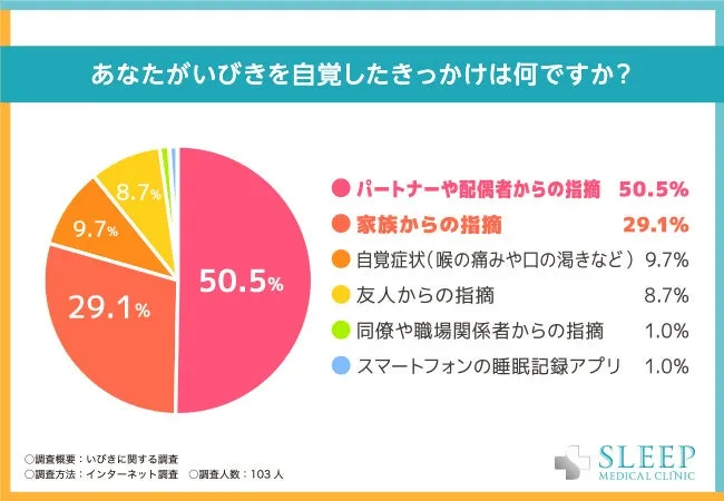 いびきは、個人の睡眠や周囲の人々の生活品質に深刻な影響を与えることがあります。全国103名を対象にした調査によると、いびきをかく人の88.3%が他者からの指摘で自覚したといいます。
