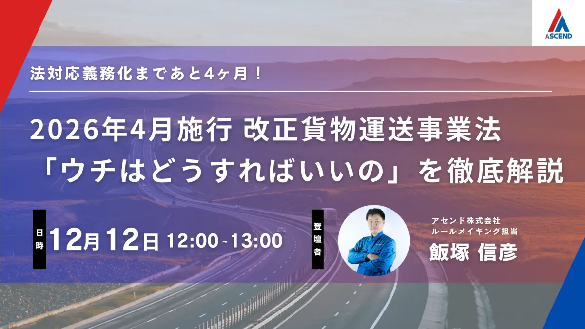 アセンド株式会社は、物流業界の変革を目指して、2026年4月から施行される改正貨物運送事業法についての無料オンラインセミナーを開催します。今回のセミナーは、運送事業者や荷主、さらには物流に関連する全事業者にとって、非常に重要な情報が得られる機会となります。