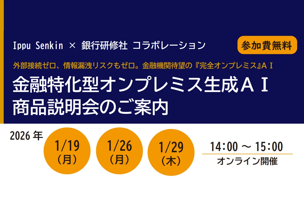 株式会社Ippu Senkinと株式会社銀行研修社は、金融機関向けの「完全オンプレミス生成AI」説明会をオンラインで開催することを発表しました。この説明会では、金融業界の特性に配慮した最先端のAIソリューションを紹介します。