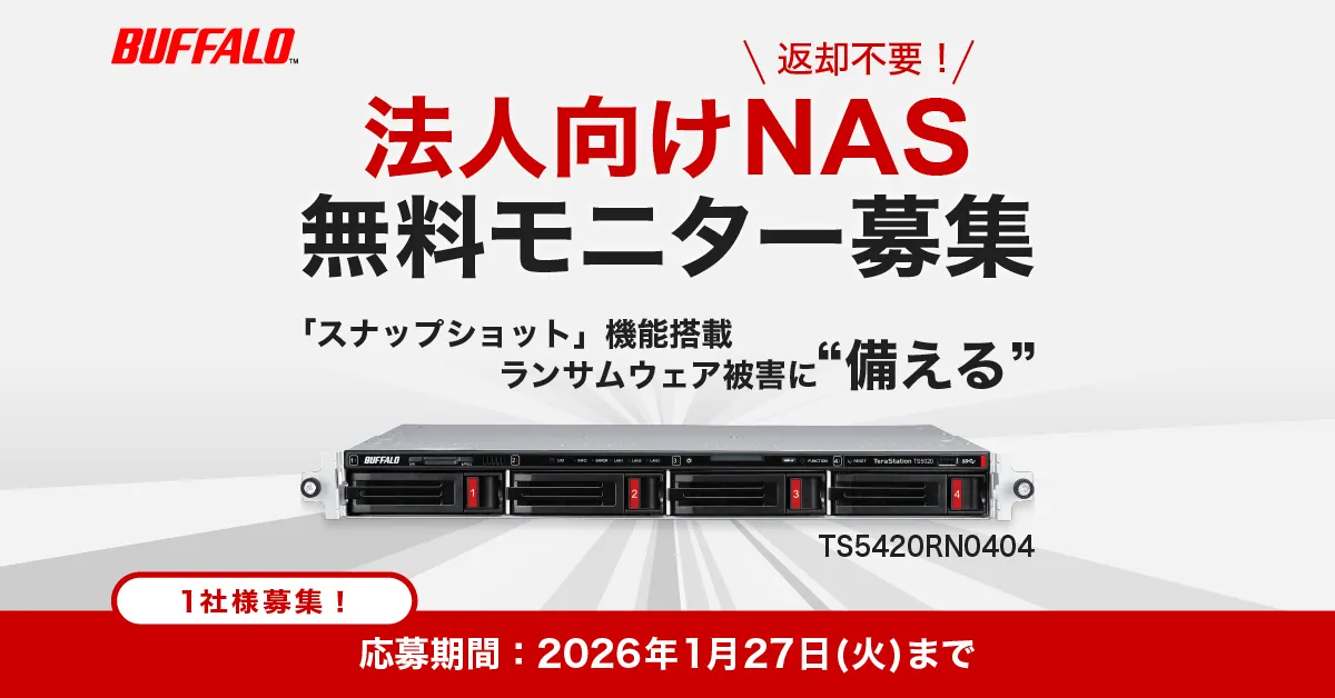 株式会社バッファローは、2026年1月に法人向けNASラックマウントモデル「TS5420RN0404」を無料でお試しいただけるモニターキャンペーンを実施します。このモデルには、高速10GbE接続とデータ保護のためのスナップショット機能が搭載されており、特に企業や自治体にとって重要なデータの管理・保護に大変役立つ商品です。