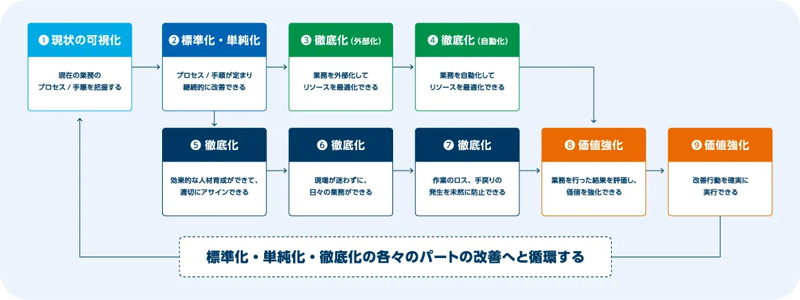 スタディストは、持続可能なリーンオペレーションを実現するために「9つのステップ」というフレームワークを策定しました。このフレームワークは、業務のムリ・ムダ・ムラを取り除くために必要な実践的な手順を示しており、個人に依存せず組織全体で活用できるよう設計されています。遅れを取ることなく、マルチスキルを持つ組織へと変革していくことが可能になります。