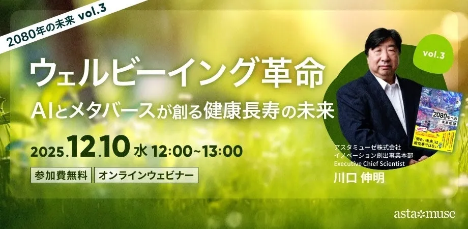 アスタミューゼ株式会社が主催する無料ウェビナー『ウェルビーイング革命:AIとメタバースが創る健康長寿の未来』が再開催されます。著名な著者であり、同社のエグゼクティブ・チーフ・サイエンティストの川口伸明氏が登壇し、未来の健康長寿に関する新たなビジョンを提示します。このウェビナーは、2025年12月10日(水)12:00から約1時間にわたり、Zoomを通じて行われます。参加は無料で、興味のある方は事前登録が必要です。