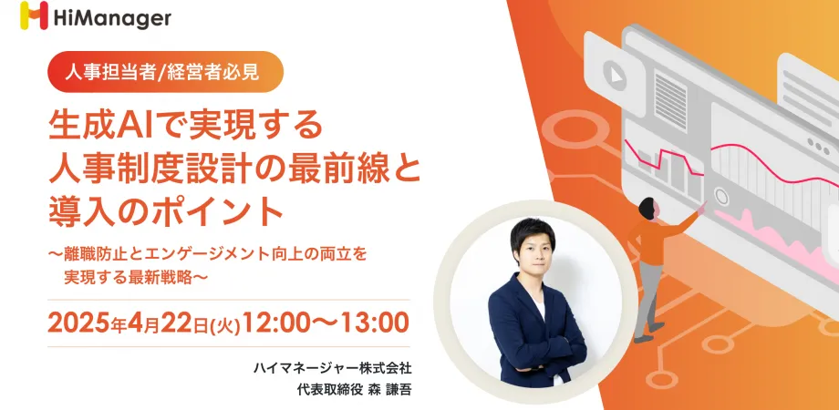 2025年4月22日(火)、株式会社ハイマネージャーは「生成AIで実現する人事制度設計の最前線と導入のポイント」のセミナーをオンラインで開催します。近年、企業の人事担当者は、若手人材の早期離職やエンゲージメントの低下という深刻な課題に直面しています。こうした状況において、生成AIを活用した人事制度の設計が鍵となると期待されています。