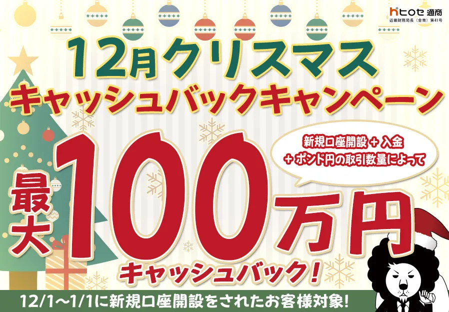 ヒロセ通商株式会社が、特別なキャンペーンを発表しました。2025年12月1日から開始されるこの「12月クリスマス最大100万円キャッシュバックキャンペーン」は、新たに口座を開設したお客様に向けたものです。これにより、ポンド円の取引量に応じて、最大で100万円がキャッシュバックされるチャンスがあります。