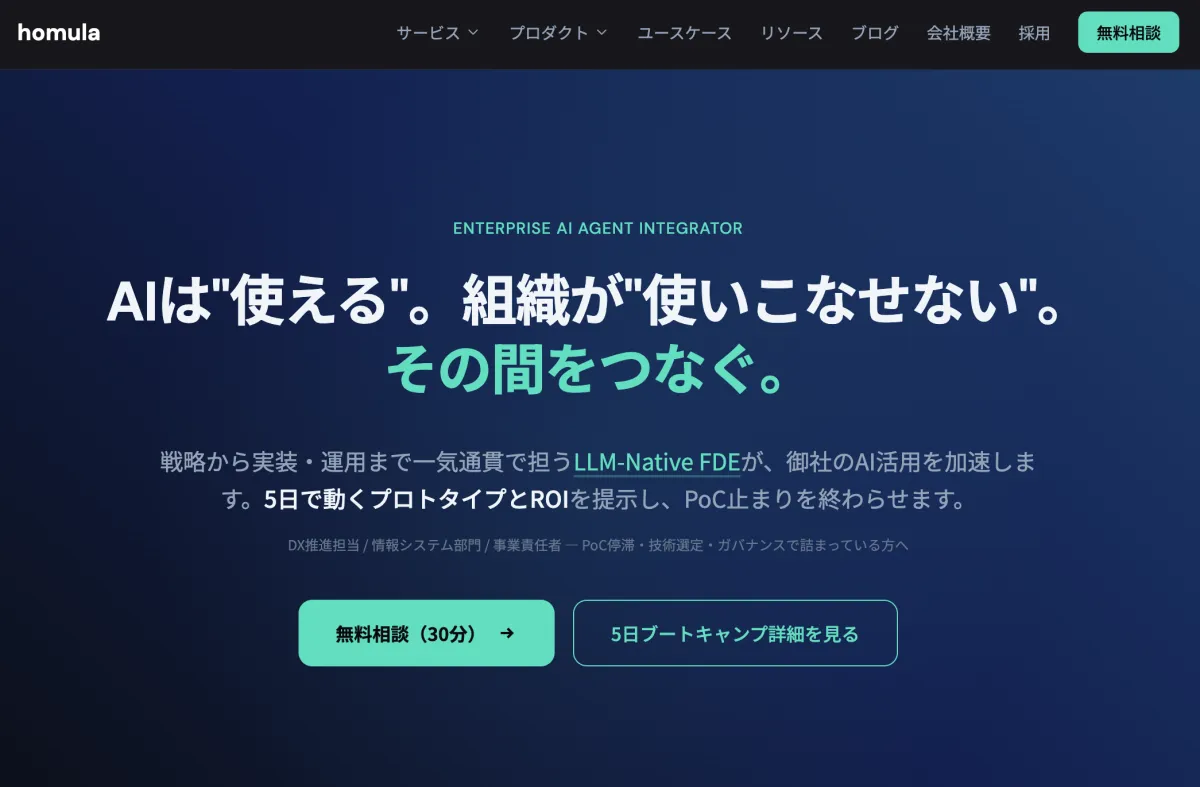 homulaは「コンポーザブルAIアーキテクト」として、AIエージェント導入の全工程を支援する企業です。先進技術と自社プロダクトを駆使し、迅速なプロトタイプ構築や本番導入を実現しています。ぜひ、詳細な情報は公式サイトをご覧ください。