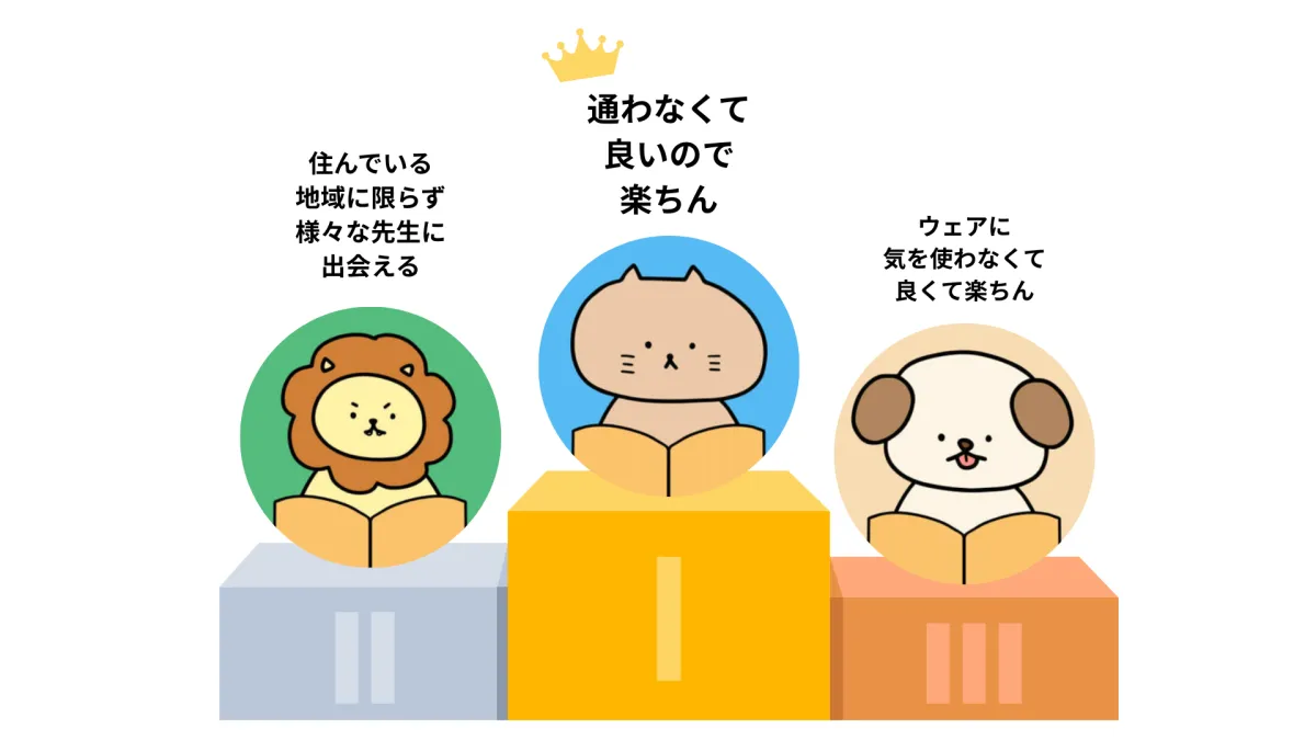 調査には125名が参加し、オンラインレッスンを受けることで得られる6つの利点を元に、「共感する」と思うメリットを選んでもらいました。その中で特に選ばれたのが「通わなくて良いので楽ちん」という点でした。これは48票を獲得し、見事1位に輝きました。続いて、地域に関係なく多様な講師に出会えることが30票で2位、ウェアに気を使わなくて良いことが22票で3位に選ばれました。