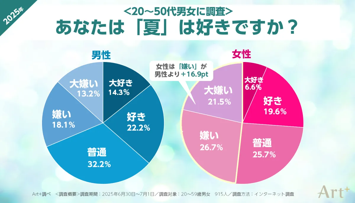 7月22日は「大暑」。一年で最も暑さが厳しいとされるこの日を迎えるにあたり、人々は夏に対する感情に葛藤を抱くことが多くなります。トレンダーズ株式会社が運営する美容医療メディア「Art+」が、20~50代の男女915人を対象に行った調査では、なんと約半数の女性が「夏を嫌い」と答えています。この調査は、男女や世代間での「夏の不快感」の違いを浮き彫りにし、快適に夏を乗り越えるためのヒントを提供することを目的としています。