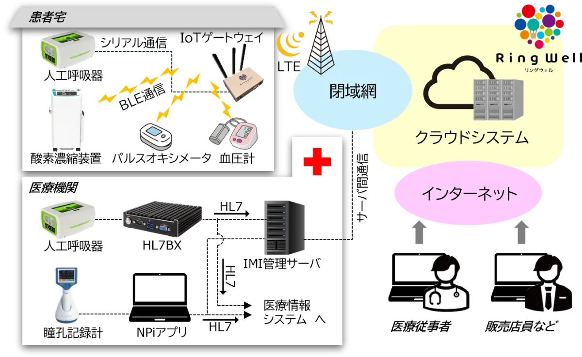 医療機関が『RingWell』を導入することで、在宅酸素療法の診療報酬としての遠隔モニタリング加算が可能になります。また、院内医療機器データ連携システム『IDM』を通じて、医療機関内に設置された様々な機器のデータを院外に連携させることが検討されています。