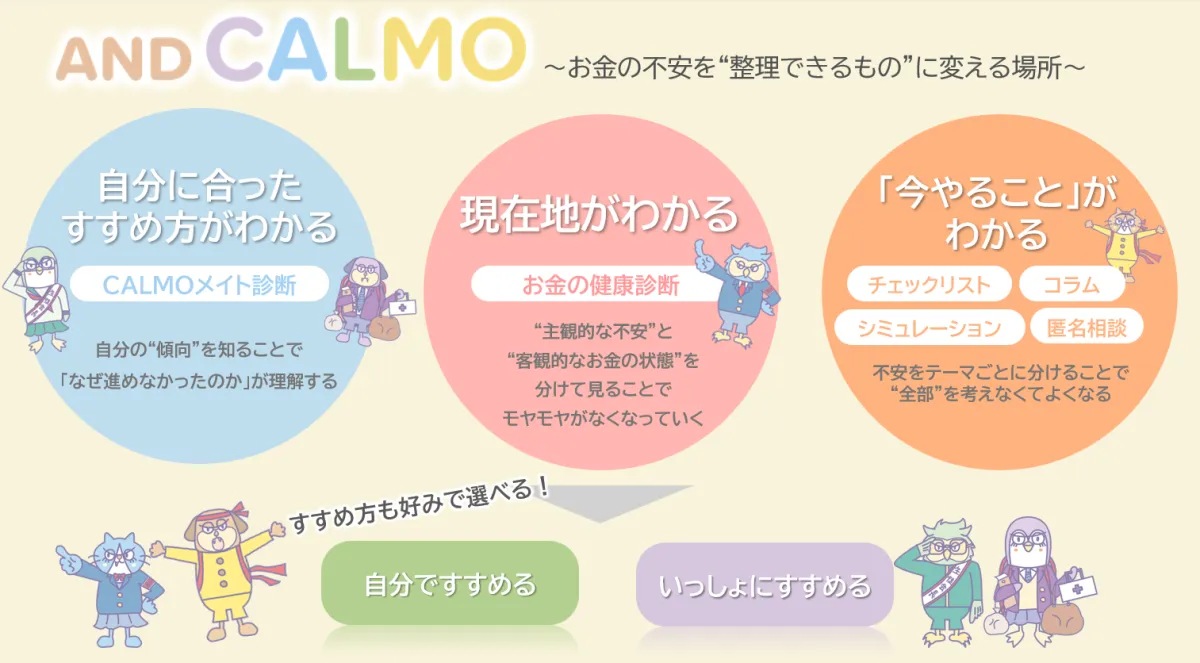 「AND CALMO」では、利用者はまず自分の状態を整理するための診断にアクセスできます。具体的には、行動傾向や性格に基づいたCALMOメイト診断を通じて、どのように不安に向き合えば良いかを見つけることができます。更に、お金の健康診断によって、主観的な不安と客観的な経済状態を適切に整理できるようになります。