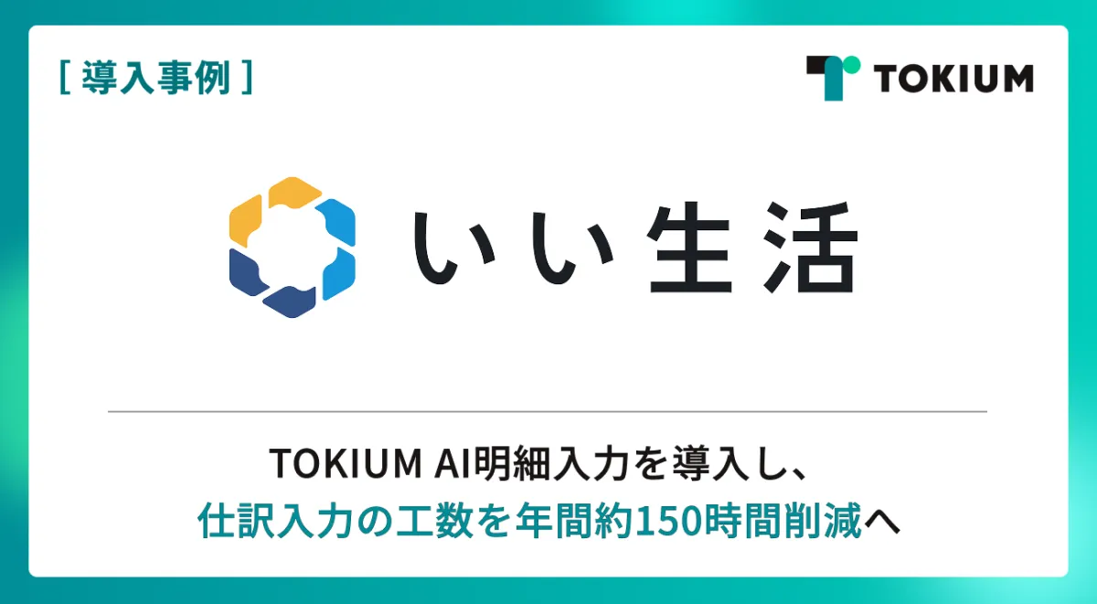 株式会社TOKIUMが提供する経理AIエージェント「TOKIUM」が、株式会社いい生活の経理業務を支援しています。この取り組みにより、いい生活は年間約150時間もの仕訳入力工数削減を見込んでおり、業務の効率化が期待されています。