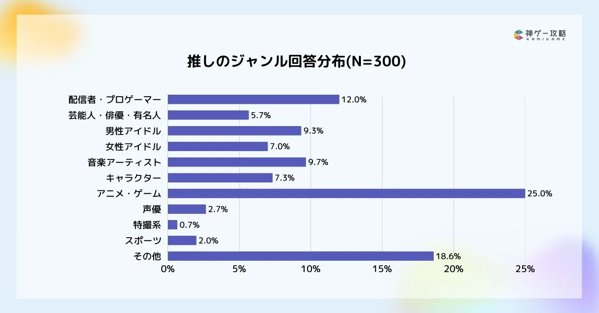 推しのジャンル: 調査によると、推しのジャンルは「アイドル・アーティスト」が最も多く、全体の26%を占めています。次に「アニメ・マンガ」が25%と続いており、ゲームキャラクターも含め、多様なエンタメコンテンツに推しが存在していることがわかりました。
