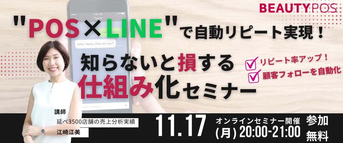 このセミナーは11月17日(月)の20時からオンラインで行われます。講師には、美容室コンサルタントの江崎江美氏が登壇し、実際のデータをもとにLINEとPOSを活用した顧客フォローツールの実践的な使い方について解説します。