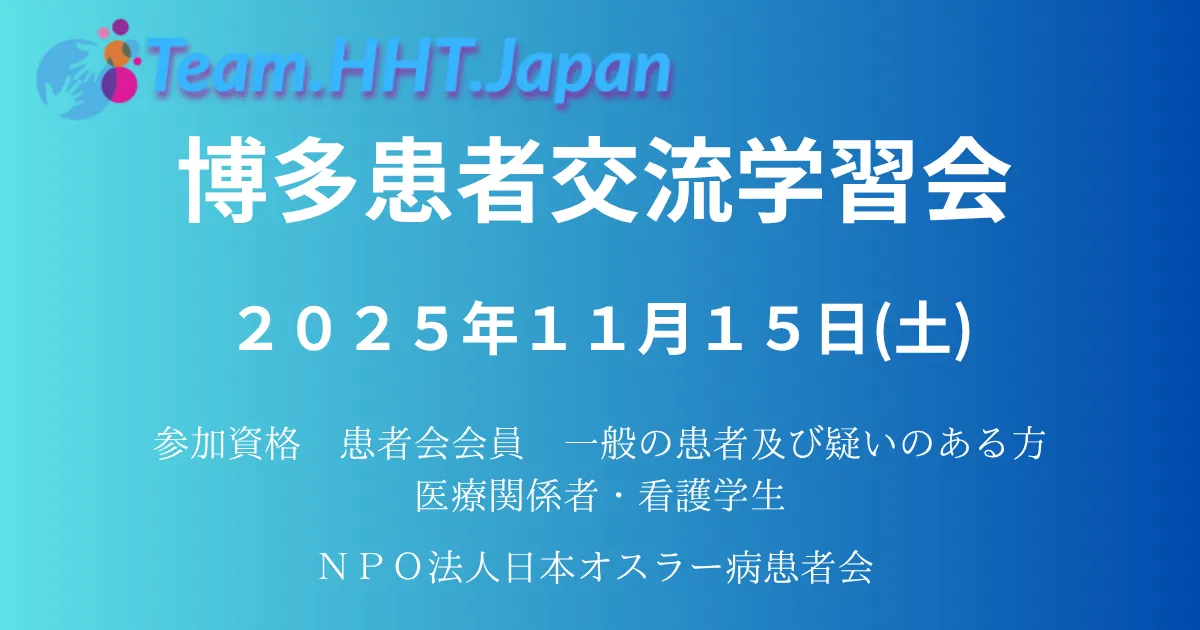 2025年11月15日(土)、福岡市博多で「オスラー病患者交流学習会 in 博多」が開催されます。このイベントは、特定非営利活動法人日本オスラー病患者会が主催し、遺伝性出血性毛細血管拡張症(オスラー病・HHT)を持つ患者やその家族、医療従事者に向けたものです。この学習会は、オスラー病に対する正しい理解を広め、患者や家族が安心して生活できる環境作りを目指して行われます。