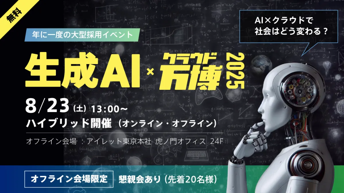 2025年8月23日土曜日、東京港区に位置するアイレット株式会社が主催する転職相談フェア「生成 AI × クラウド万博2025」が開催されます。本イベントはオンラインとオフラインのハイブリッド形式で行われ、ITエンジニアにとってのキャリアの未来を探る貴重な機会となります。