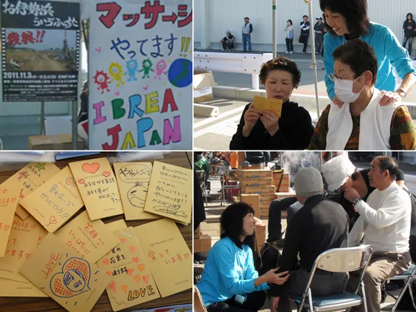 イベントには、神戸や大阪、名古屋、東京などから集まった9名のブレイントレーナーが参加し、会場の一角に設けたテントで施術を行いました。彼らが用いた「ファルゴン」と呼ばれるマッサージ手法は、脳教育に基づいたもので、体をほぐしながら被災者たち側の健康や心理的な悩みを親身に聴く姿勢が印象的でした。そのため、マッサージを希望する方々が多く、順番待ちができるほどの人気を集めたのです。