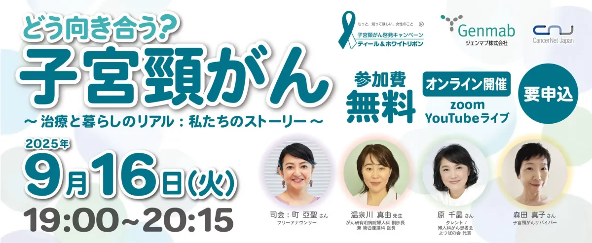 2025年9月16日(火)に、認定NPO法人キャンサーネットジャパンとジェンマブ株式会社の共催による「どう向き合う?子宮頸がん~治療と暮らしのリアル:私たちのストーリー~」がオンラインで開催されることになりました。このセミナーは、子宮頸がんの最新情報や治療法を学び、また患者としての経験を共有する場として、多くの方に向けて開かれます。