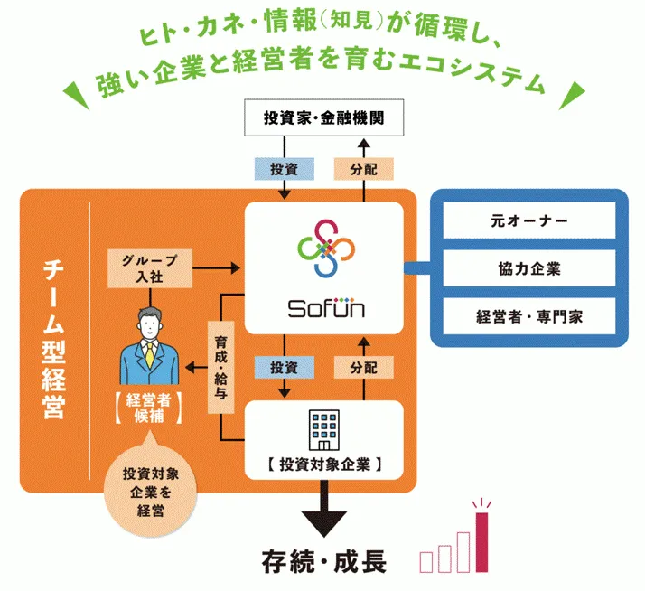 SoFun株式会社は、「中小企業が再び輝く社会を作り、日本をおもしろくする。」というビジョンのもと、経営者の発掘や事業承継型投資に力を入れています。特に、地域に根ざした企業が持つ独自の資産や技術を活かし、再成長を目指すサポートを行っています。