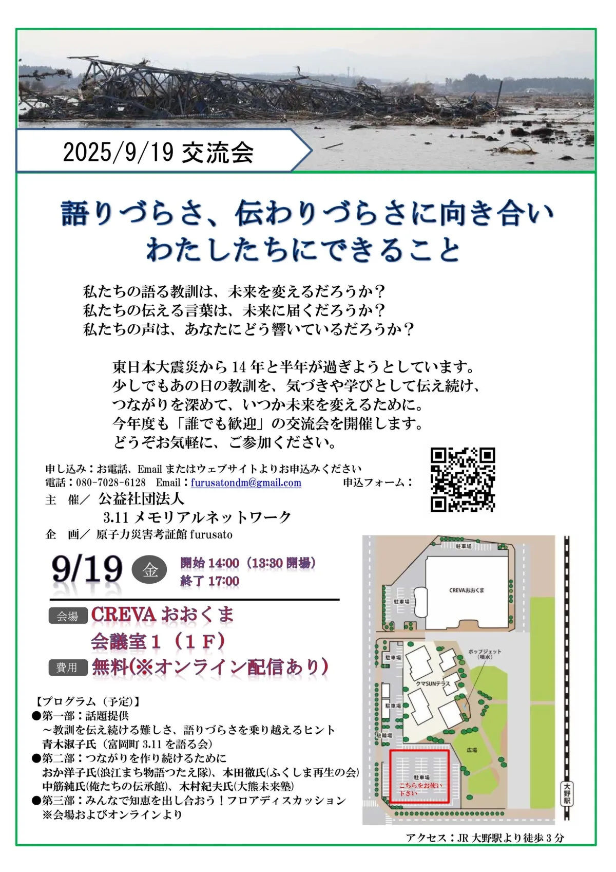 東日本大震災から14年半が経過し、私たちはその教訓をいかに次世代に伝えていくかを真剣に考える時期に差し掛かっています。9月19日、福島県大熊町で「3.11メモリアルネットワーク福島交流会2025」が開催されます。このイベントは、震災にまつわる語りづらさや伝わりづらさを乗り越える手助けを目的としています。