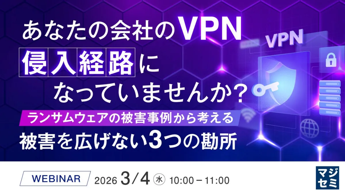 昨今、ランサムウェアによる被害が相次ぐ中、企業のVPN(仮想プライベートネットワーク)がその侵入経路となっているケースが増加しています。特にリモートワークやクラウドサービスの利用が一般化する中で、VPNは新たなセキュリティ問題を抱えています。このような背景から、我々は「あなたの会社のVPN、侵入経路になっていませんか?」をテーマにしたウェビナーを開催します。