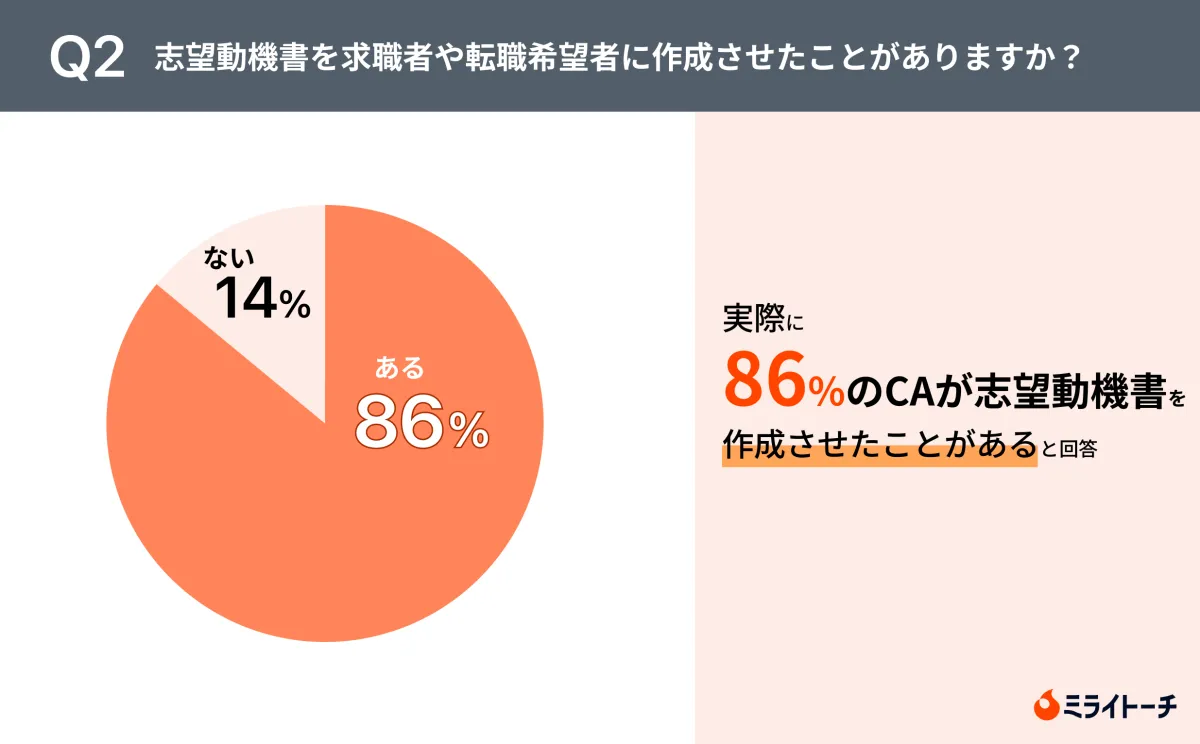 企業が中途採用を行う際、採用担当者は応募者の長期的な働きと、一致する人材かどうかを重視しています。この点において、志望動機書は応募者の熱意や適性を強くアピールするツールとなります。調査によると、86%のキャリアアドバイザーが実際に転職希望者に志望動機書を作成させた経験があり、彼らはこの書類が選考を通過するために必須であると考えています。